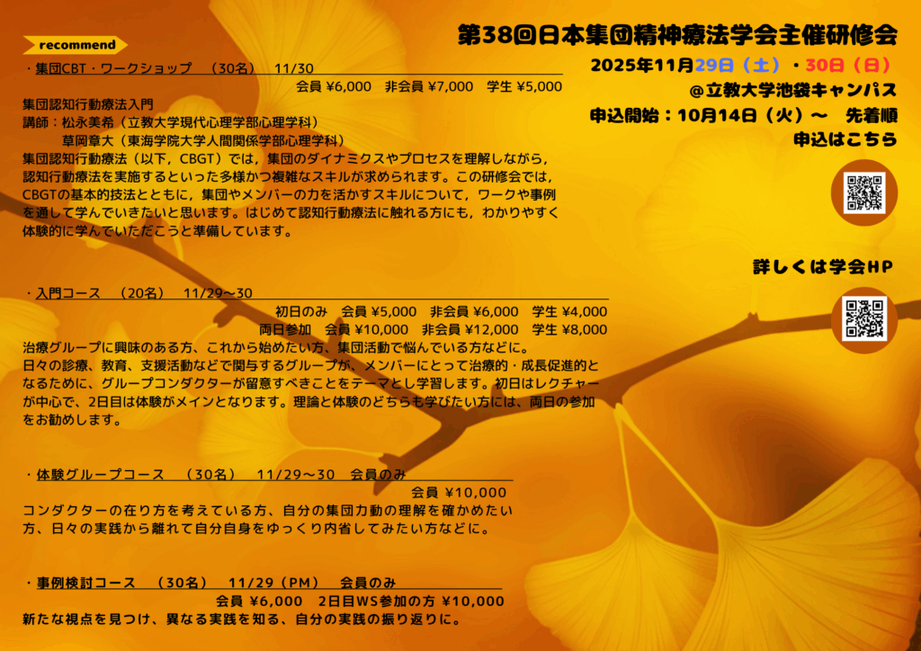 集団CBT・ワークショップ | 11/30 | レクチャー・体験 | 会員・一般 |